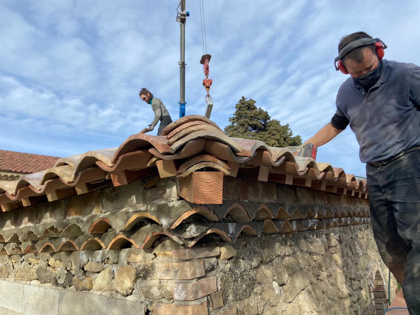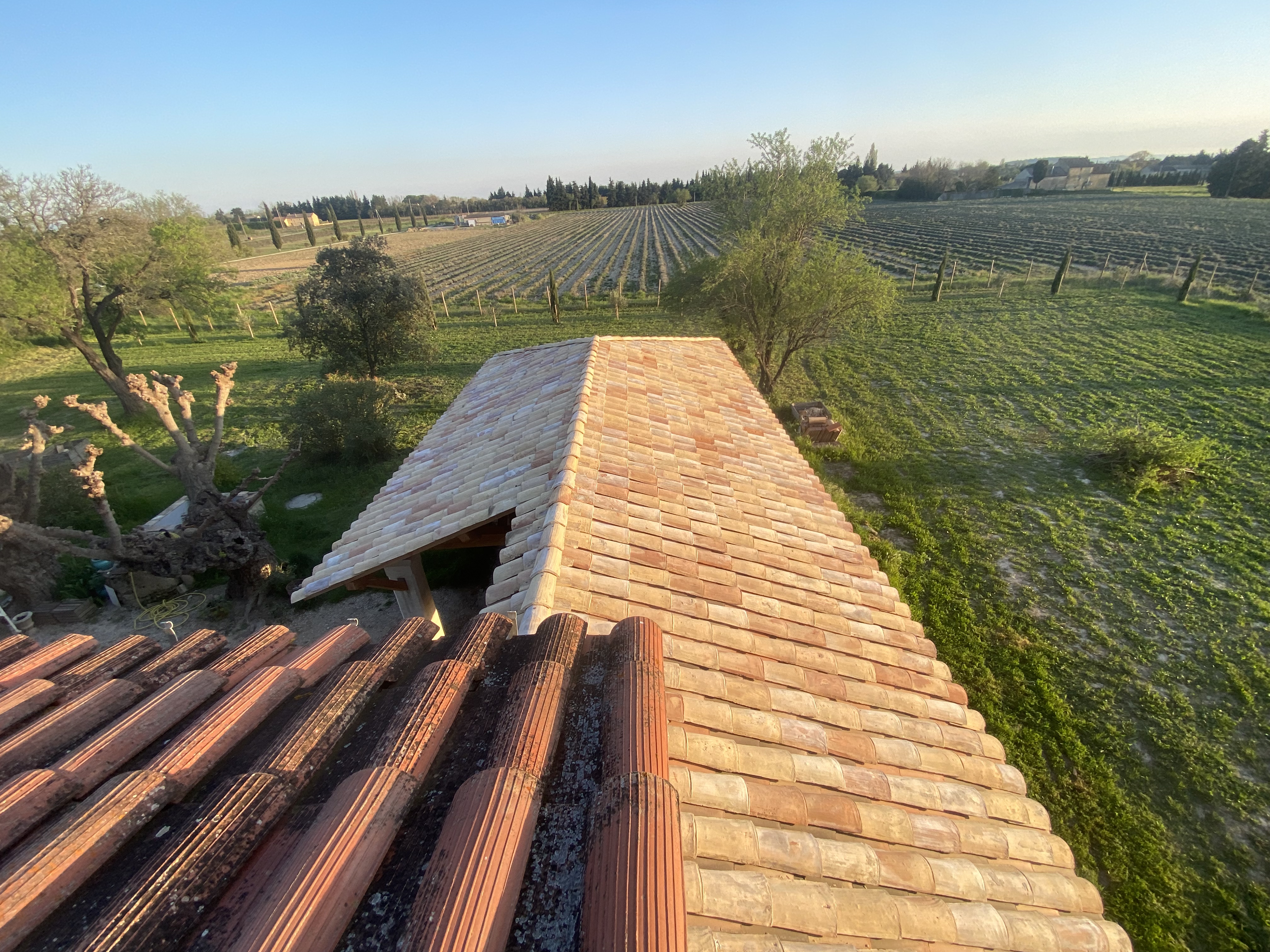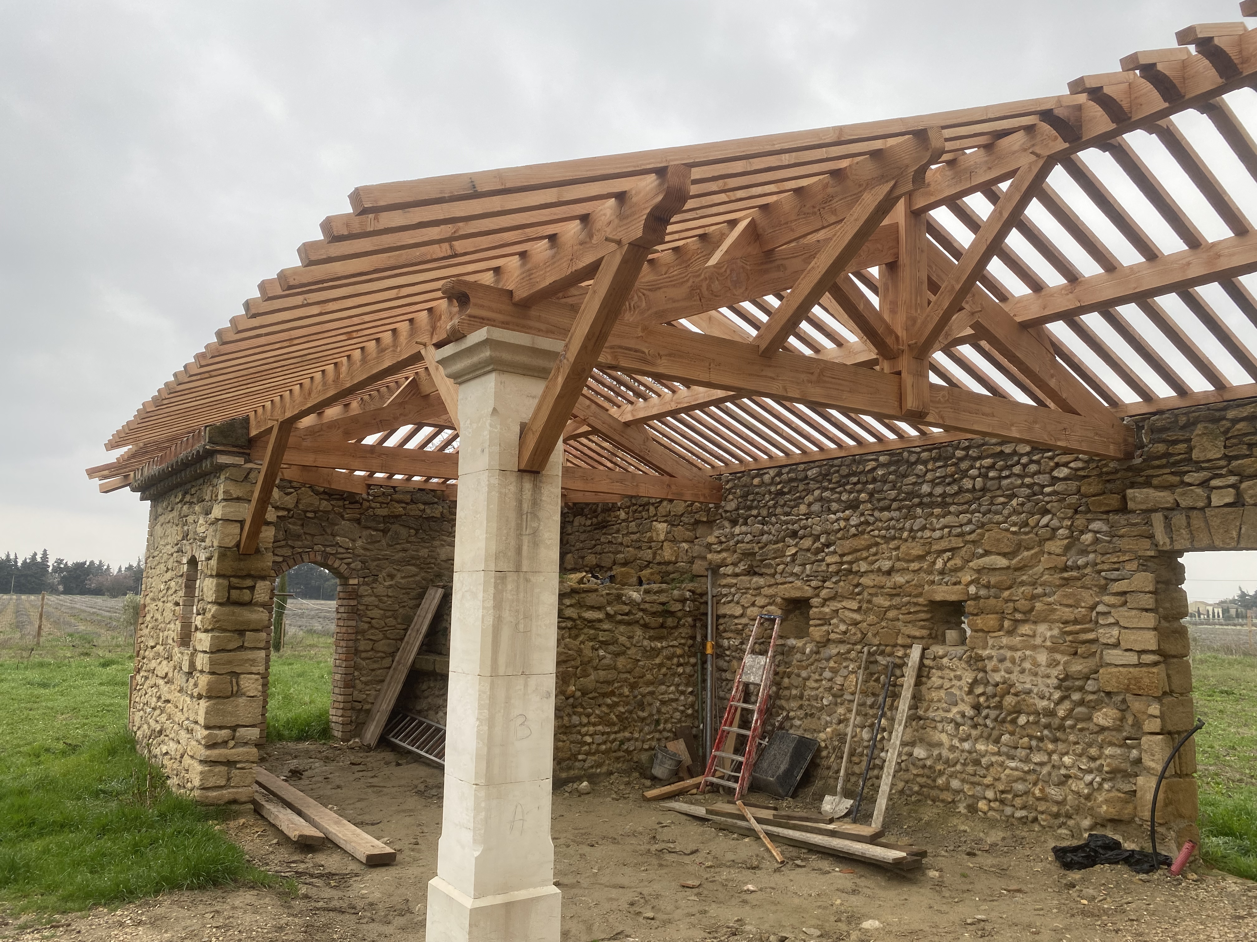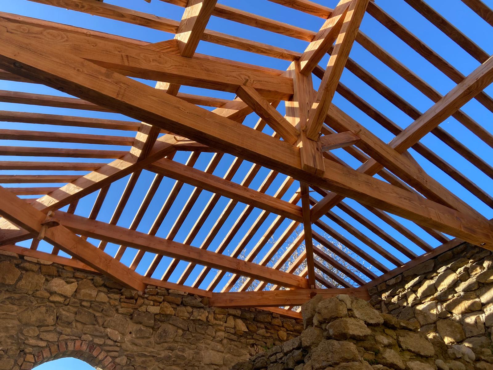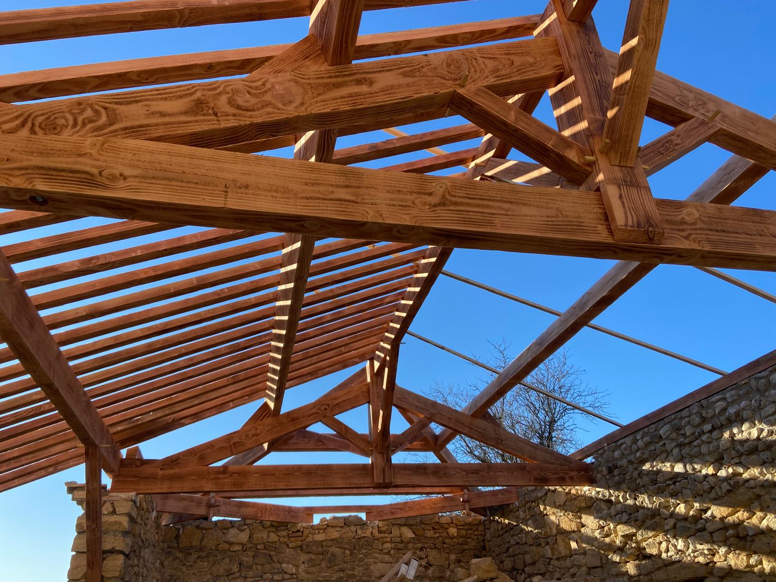 05/01/2026Fabrication d'une charpente en douglas sur une vielle bâtisse, tuiles canal neuves en courant et tuiles canal anciennes en couvert